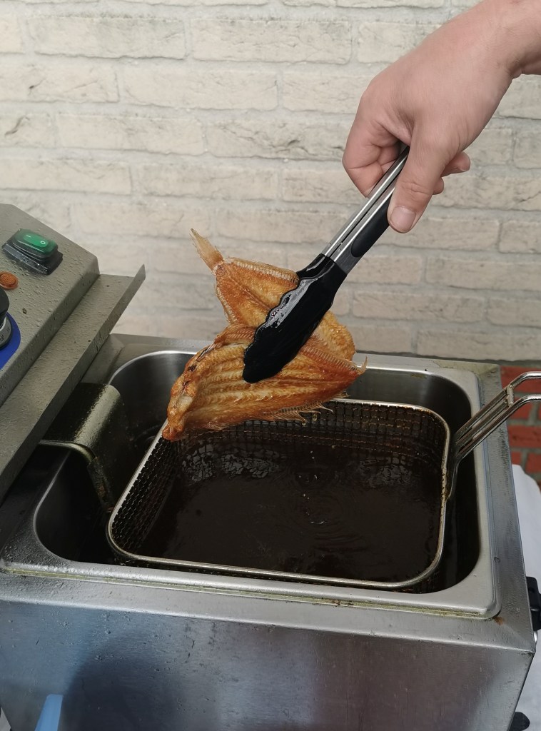 We eten ook wel mooie grote Noordzee tong. Ik vind het zonde om die in de frituur te laten zwemmen. Grote tong hoef je alleen maar in de room boter om en om te bakken. De vis is binnen 5 minuten gaar. Voordat ik ga bakken strooi ik wat peper en zout of viskruiden over de tong. Ongelofelijk lekker. Je kunt er nog iets bij serveren zoals salade of wat groente. Ik ga meestal alleen voor de vis.
